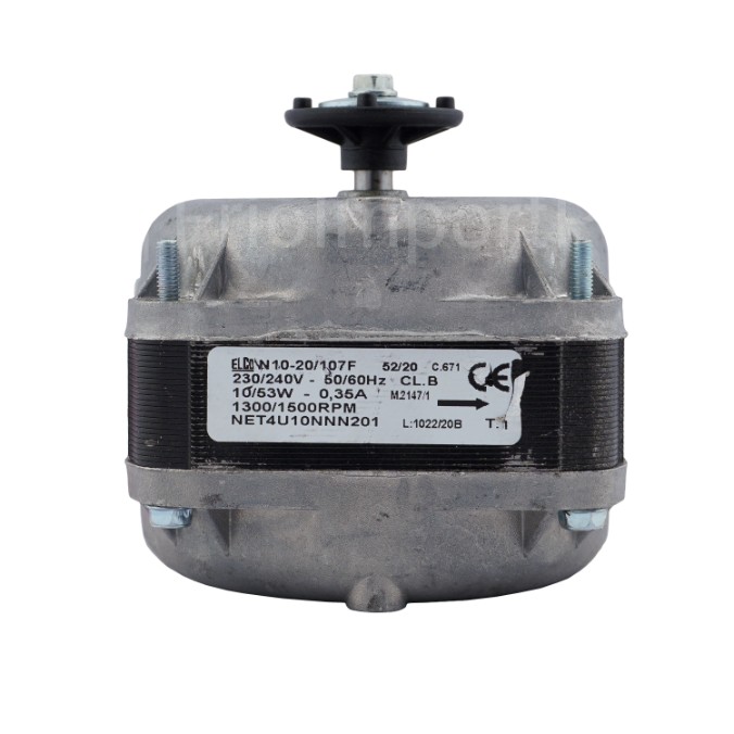Motor de ventilador de 10 Watts marca Elco. Fuente de alimentación 220v 50/60Hz 0.35A 1300/1500RPM de velocidad. Incluye base y Aspa de Aluminio. Para uso en calefacción, ventilación, aire acondicionado y equipos de refrigeración y exhibidoras. Productos de alta calidad.